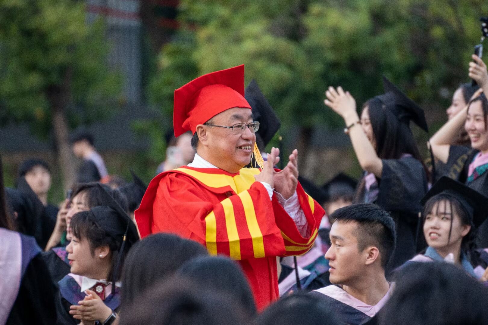 各学院毕业班辅导员们的“最后一次点名”标志了大学四年的收官,一首《凤凰花开的路口》更是充满不舍与感慨。而这样特殊的演唱,也将成为毕业生们最为难忘的记忆伴随着歌声的结束,毕业典礼也将进入尾声,教师们纷纷起身面向毕业生们,以注视留念,以挥手作别。