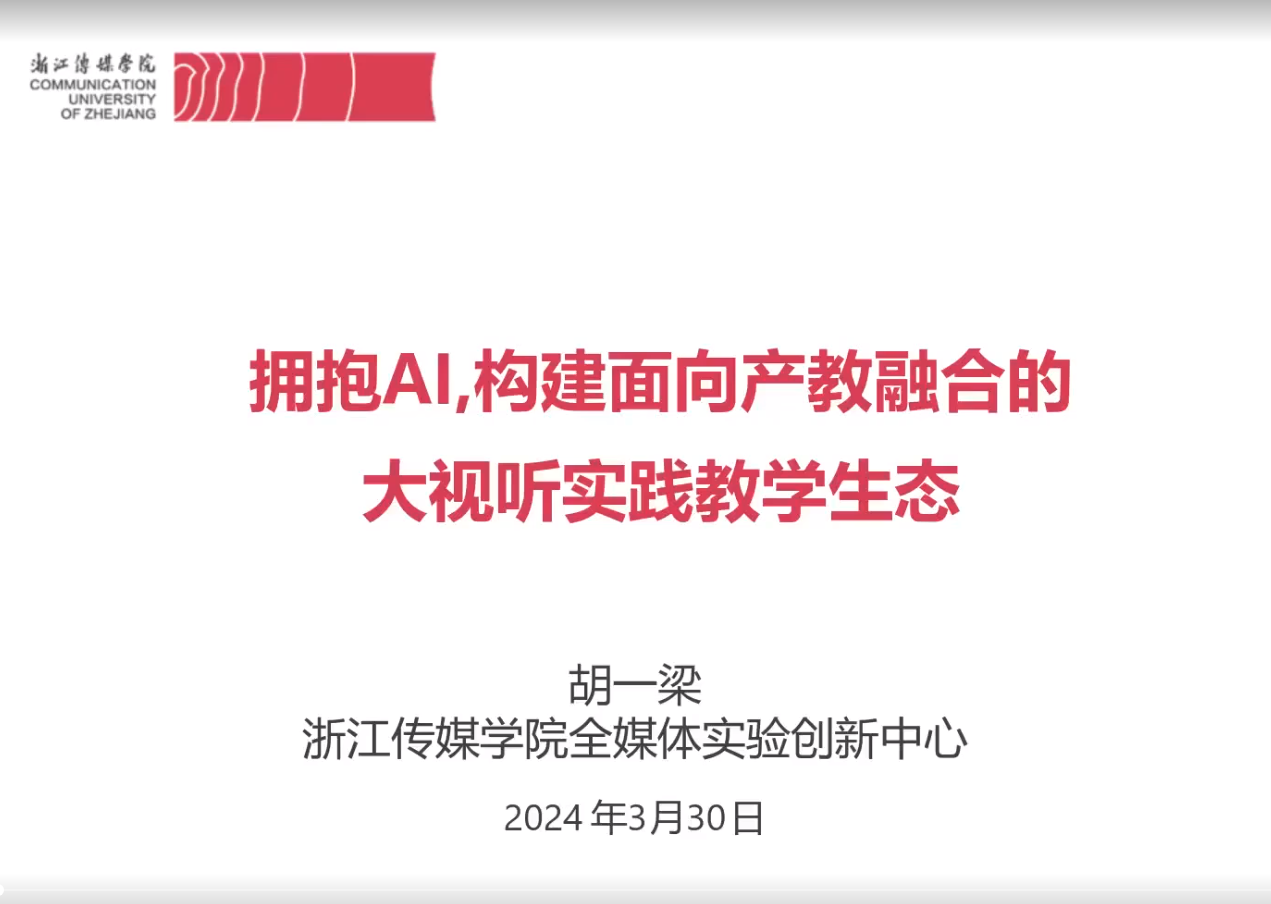 在研修班的课程中,浙江传媒学院全媒体实验创新中心副主任胡一梁教授以“拥抱AI,构建面向产教融合的大视听实践教学生态”为主题,分享了新一代媒体信息技术对传媒实践教学的影响和挑战。胡教授强调,面对AIGC、Sora等新一代技术的快速发展,传媒实践教学需要在育人理念、产教融合、教学模式等方面进行深层次变革,以塑造“智能+”产教融合实践教学新生态。