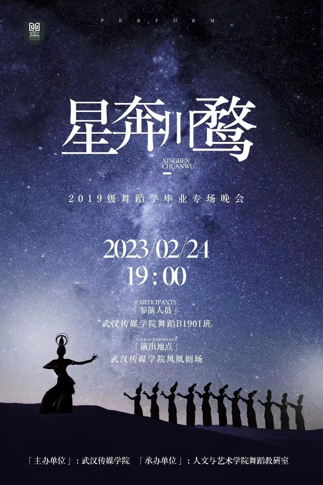 (武传新闻网讯 记者 陶明 杨诗怡)2月24日晚7时,我校人文与艺术学院2019级舞蹈学“星奔川鹜”毕业晚会在校凤凰演播厅举行。本次晚会由人文与艺术学院舞蹈教研室承办,舞蹈B1901班参演。