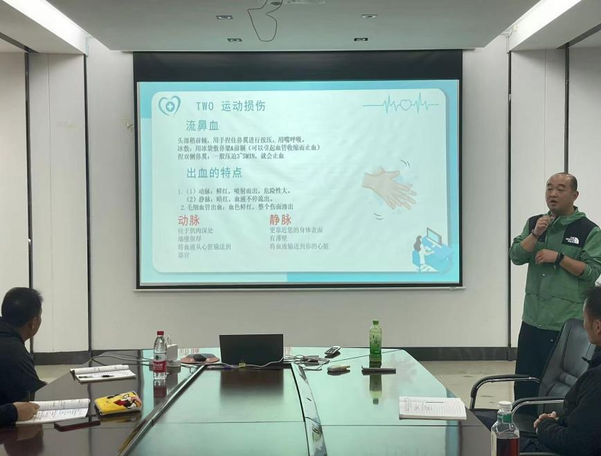 此次培训由体育教研室黄蕾老师主讲,黄蕾于2021年参加武汉市红十字会救护培训班学习并通过考核合格,取得《红十字救护证》。黄蕾从运动损伤紧急救治原则、常见运动损伤症状及其处理方法、心肺复苏的流程与注意事项以及在紧急救治中的其他措施等四个部分进行讲解。