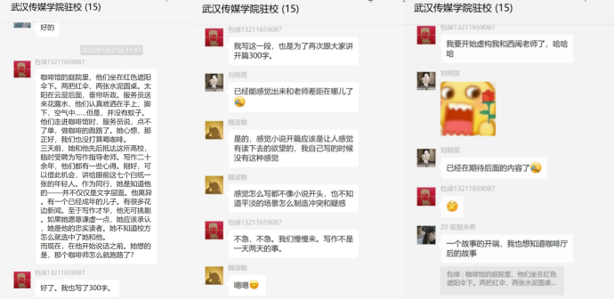 每天的写作训练,两位老师都要求大家发到学习讨论群,大家相互学习同伴的稿件,要求大家评出每份作品最闪光的对方,指出需要修改的建议。在这样的展示训练中,每个同学对自己交出去的稿件格外用心,大家的写稿的拖延症、交际的社恐症得到一定的治疗。