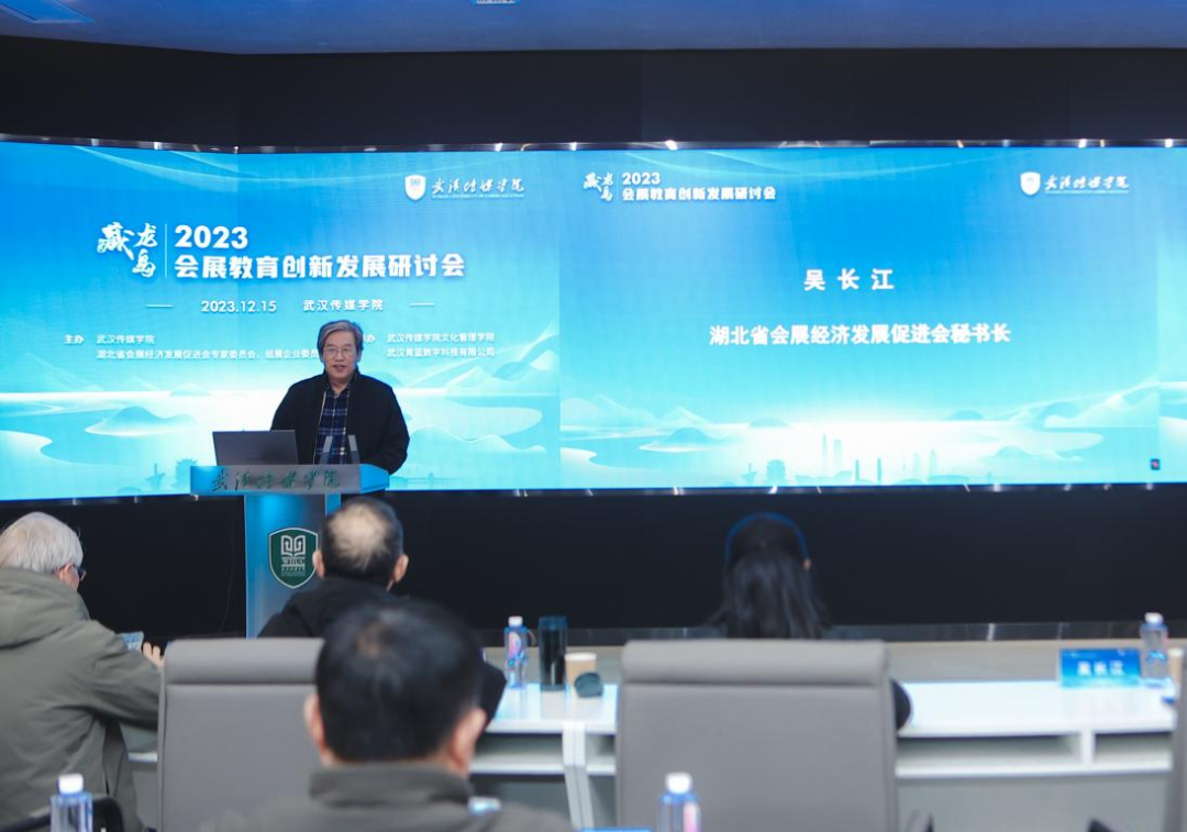 湖北省会展经济发展促进会秘书长吴长江代表促进会致辞。他表示,本次研讨会是湖北省高等院校联合会展业社团创办的首个以会展教育为主题的会议活动,会议将贯彻落实既创新、又务实、特色鲜明、意义不凡的活动理念。