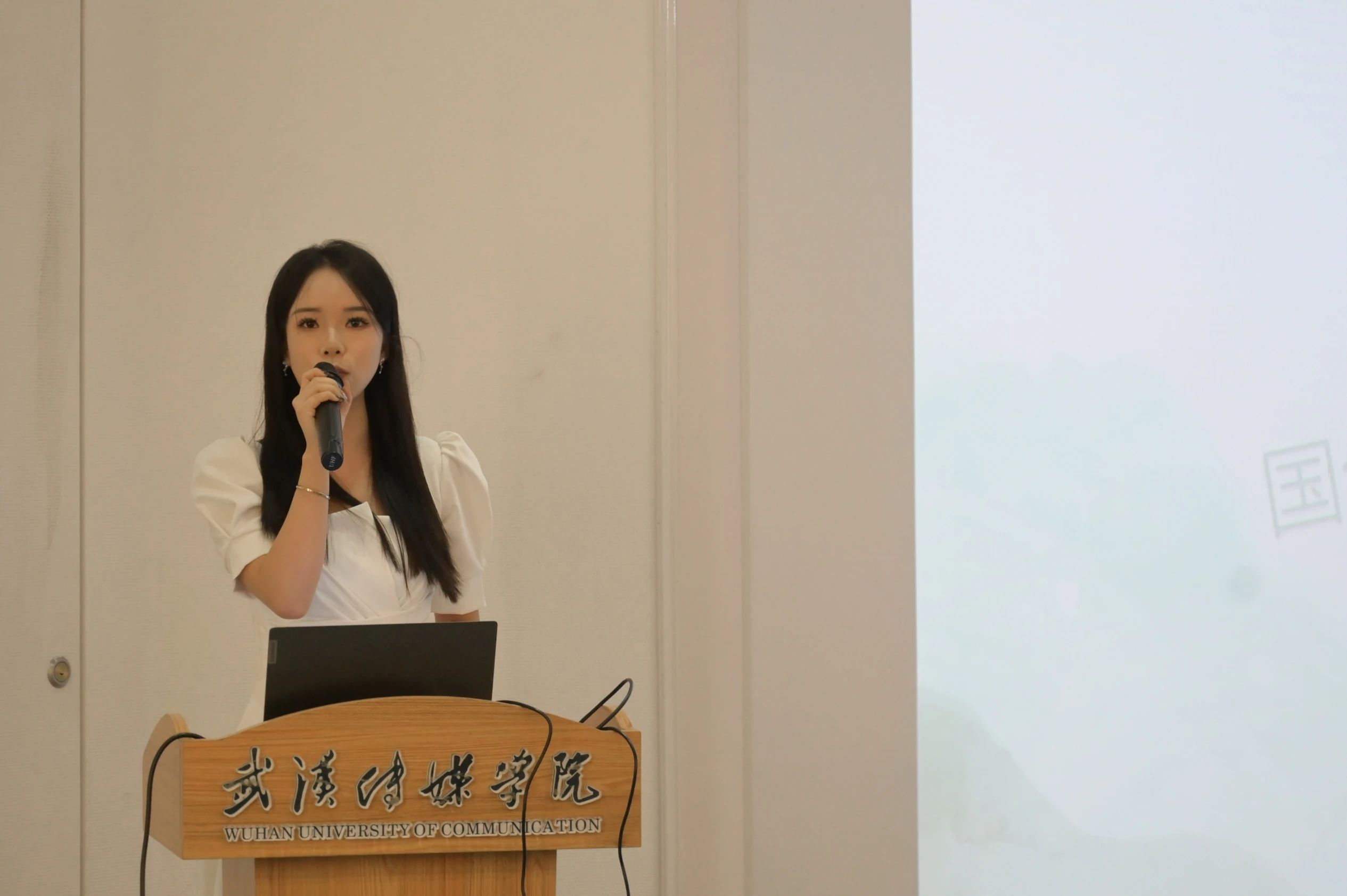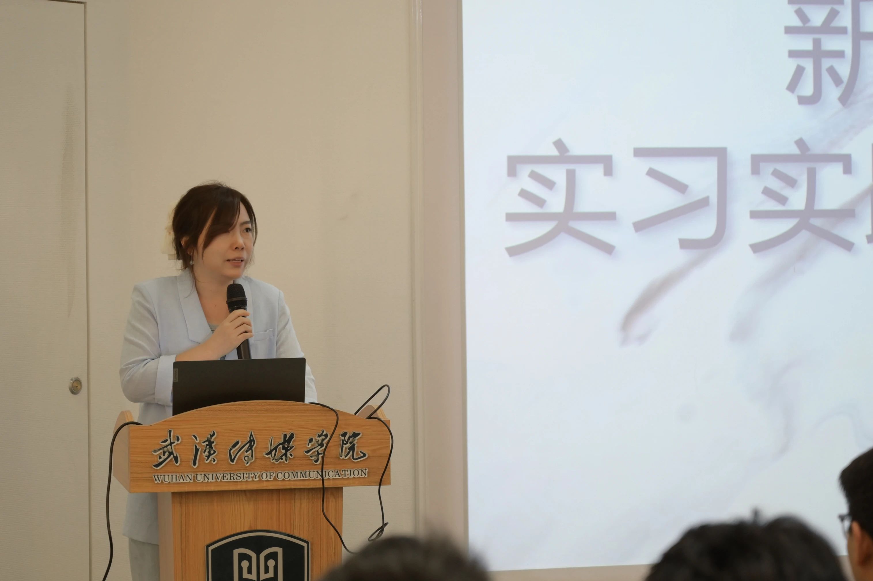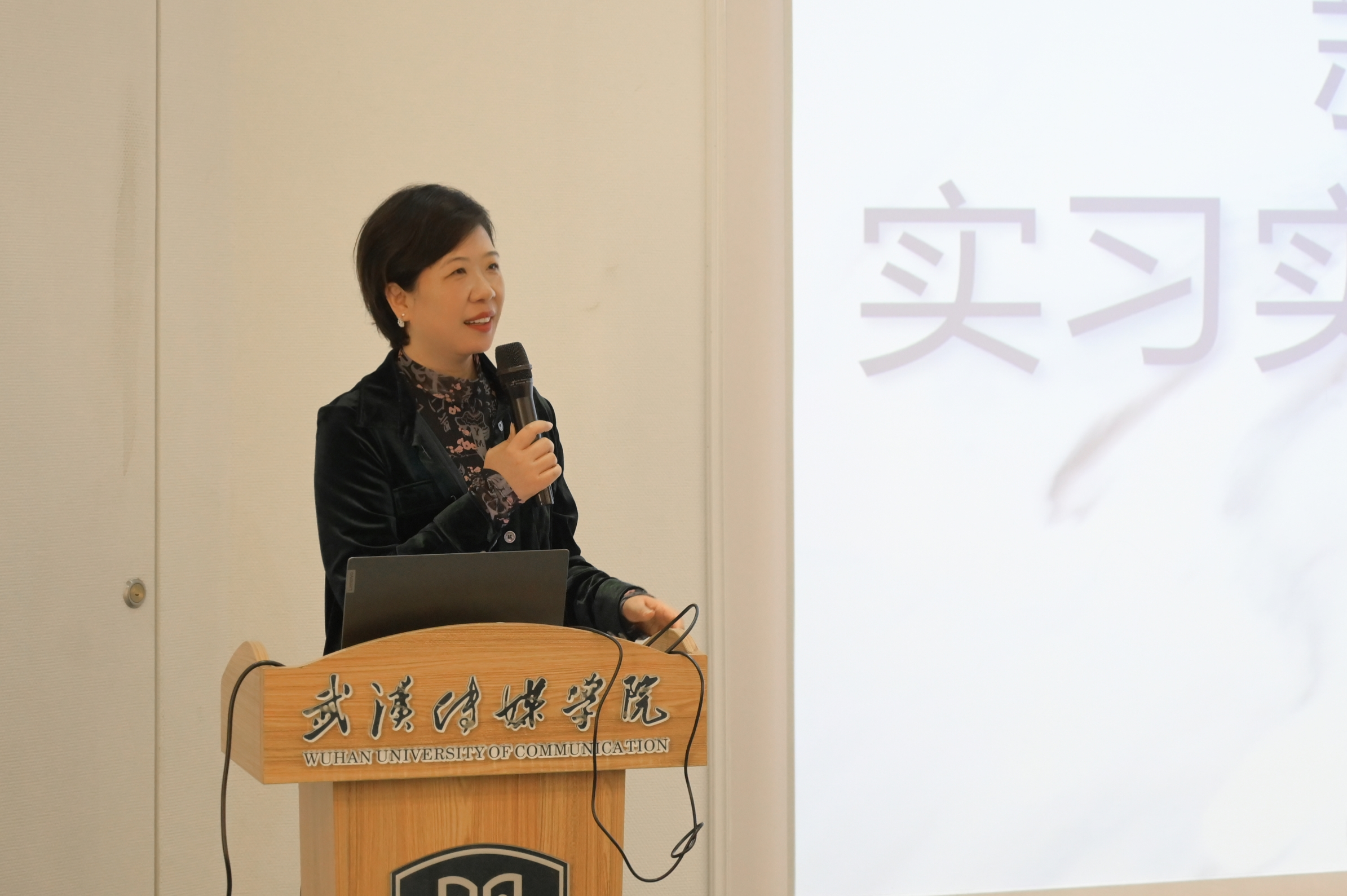 紧接着,来自荆楚网(湖北日报网)的副总编辑查昭和湖北海外旅游集团的副书记方敏为同学们进行经历分享。查昭表示,在荆楚网实习的我校学生很可爱、很能干,尤其是动手能力超强,并多次在现场提到几个实习生的名字。同时,也是由于上届接收的6位实习生表现优异,所以这次荆楚网将实习生名额增加至11个。方敏则介绍了我校和湖北海外旅游集团共同建设实习基地的情况,并对校企未来深度合作充满期待。