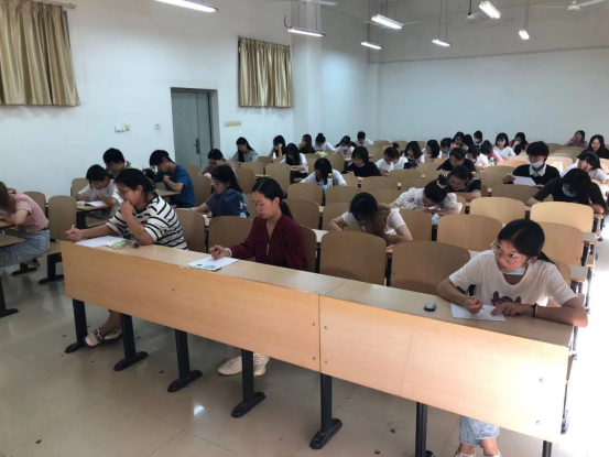 此次大赛吸引了全校一百多位学生参加,选手们下课后来不及吃午饭就早早到达了赛场做准备。当日气温高达37度,加上严肃的比赛气氛,让本已如烤箱的考场更加闷热,但是参赛选手个个镇定自若,信心满怀,他们有的凝神思考,斟酌字句;有的文思泉涌,下笔有神。监考老师洪俊、罗迪、黄婷认真监督以确保比赛公平有序进行。