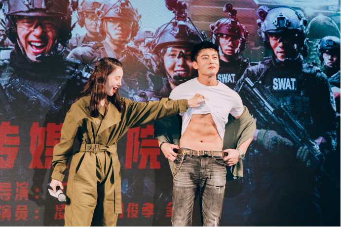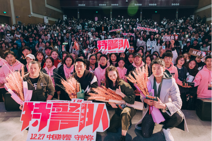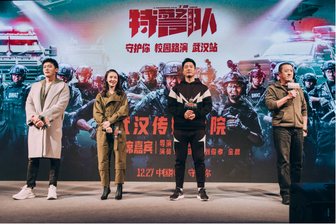 在播放两个激动人心的电影片段之后,导演丁晟与主演凌潇肃、刘俊孝、金晨来到台前,与现场观众交流互动。导演丁晟在现场对演员们的敬业精神给予肯定并说道:“不管是水下还是空中的打斗,都要求演员不用替身。为了让他们把自己当作真正的特警,演员在拍摄之前还与专业特警进行了为期半个月的封闭训练。”演员凌潇肃讲述了自己吊威亚时的受伤经历,并称在拍摄期间,受伤已然是家常便饭,由此可想而知,特警在日常训练以及执行任务时的艰辛与危险。四位主创在现场多次对特警队致以敬意。