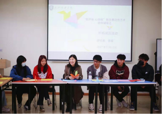 为了帮助新生顺利地适应大学生活,提升动手能力,激发创造力,2021年11月12日下午,心理中心李霞老师带领同学们在团体辅导室开展了“新开始,心征程”新生表达性艺术团体辅导活动之折纸减压活动。