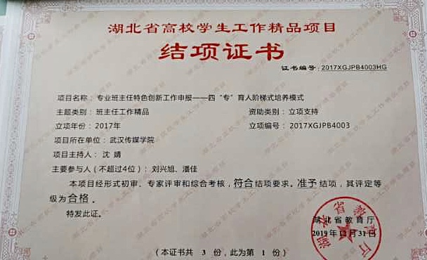 2017年,学校共有2项学生工作精品项目获得省教育厅立项支持。通过为期两年的课题立项研究,经教育厅组织开展的形式初审、专家评审和综合考核等程序,最终沈婧主持的学生工作精品项目《专业班主任特色创新工作申报—四“专”育人阶梯式培养模式》、李霞主持的学生工作精品项目《在艺术院校开展工作坊模式的心理健康课程探究》结项验收结果为合格。