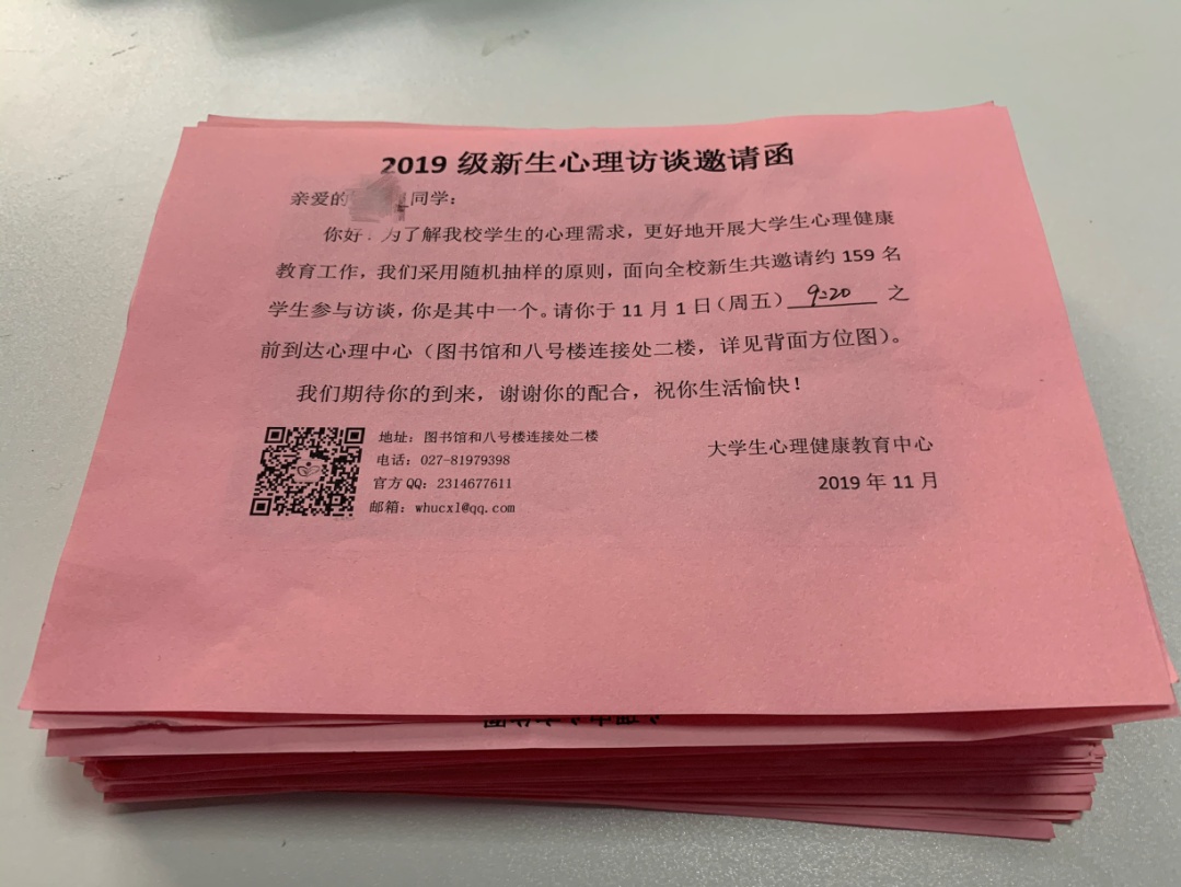 为进一步了解和评估新生的心理适应情况,11月1日,我校心理健康教育中心采用随机抽选的方式邀请了160名新生进行了一对一心理访谈,覆盖全校7个学院。
