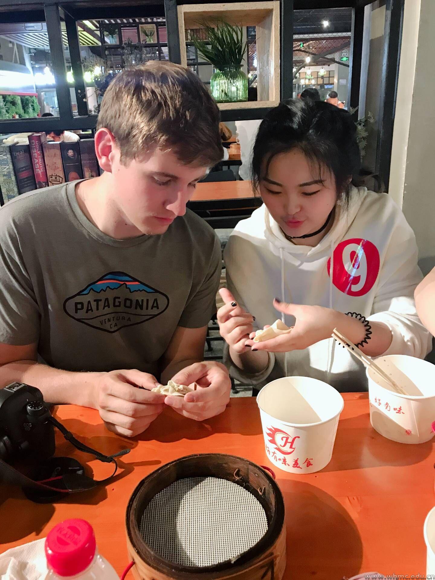 武传新闻网讯(文/见习记者 李乐 图/摄影 通讯员 黄娴)“先把饺子馅放中间,再把两边面皮粘一起。”5月10日,2017级汉语言文学专业学生郎文在学校食堂手把手教美国学生包饺子,现场瞬间变成了饺子DIY大课堂。此外,交流生还参加诗词大赛、剪窗花、试穿汉服等传统文化活动。