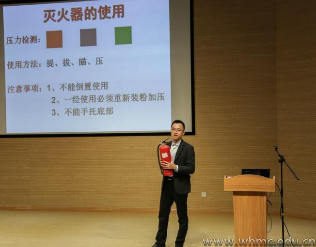 樊国诚老师指出,全世界平均每天有900起火灾,武汉平均每天有6-8起火灾,这些数据和事例都说明火灾就在身边,我们要有良好的消防意识,做到有备无患,这样才能保护自身安全。随后,樊国诚现场讲解了灭火器压力检测和灭火器的使用方法,还介绍了灭火器、防毒烟呼吸面具、燃气泄漏报警、烟感器等6种家庭紧急自救“武器”。