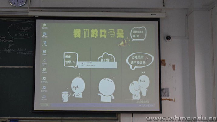 据了解,教2楼25间教室投影仪桌面,全部更换为了特制的表情包壁纸。一些劝告学生爱护教室的提示语,都被配上了憨态可掬的“颜文字君”表现出来,表情包们或叉着腰提醒随手关灯,或将垃圾放入垃圾桶,或阻止吸烟。