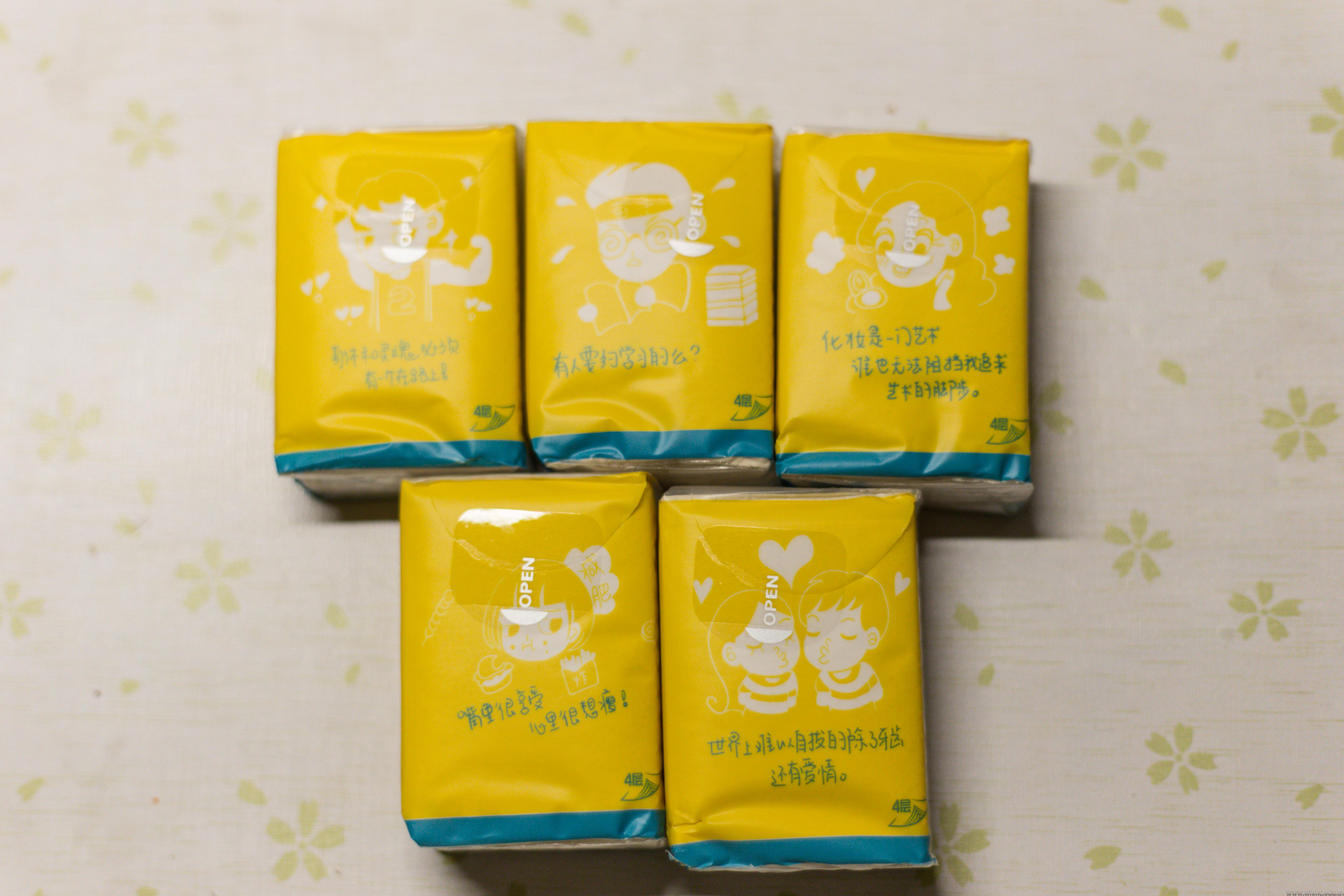 成箱的纸巾被有序地摆放在摊位上,有小包的抽纸包也有一条十包售卖的小包纸巾,两种包装,同一价位。售卖的纸巾的正面共有5种图案,分别是女生照镜子化妆的化妆型,爱心包围着情侣的恋爱型,2号球员炫耀肌肉的运动型,一手握着薯条蛋糕一边想着减肥的减肥型,以及绑着“奋斗”头巾的学霸型。纸巾的背面印着“友谊的小船”的标志。