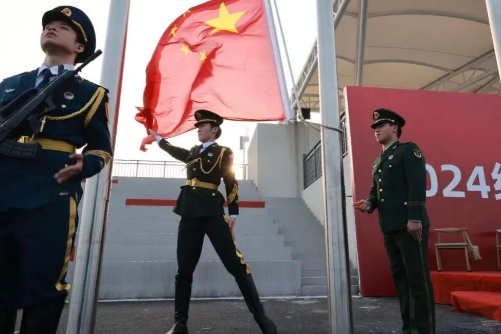 升旗仪式正式开始,伴随着庄严的国歌声,五星红旗冉冉升起。