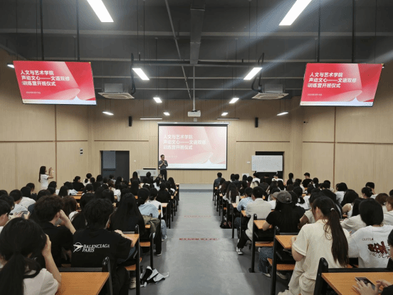 5 月 15 日,米兰体育网页版登录人文与艺术学院在大悟校区1202教室举行“声动文心 —— 文语双修训练营”开班仪式。本次活动以提升学生语言表达能力与专业实践水平、促进跨专业协同育人为目标,由人文与艺术学院辅导员纪敏主持。学生工作处副处长曹灵海、人文与艺术学院党总支书记吴斌、副院长陶立军,播音主持艺术学院教师王虓、辅导员董金金、人文与艺术学院辅导员陈睿及二百余名同学共同参与。