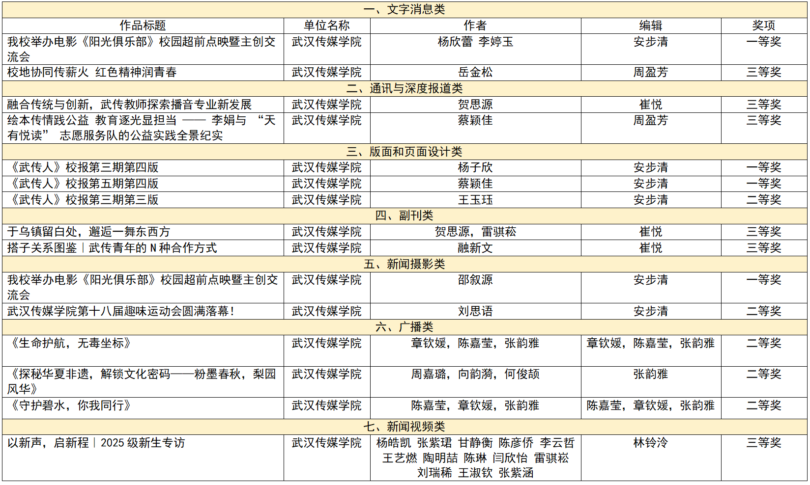 湖北高校新闻奖是全省高校新闻领域最具权威性和影响力的年度评选,涵盖文字消息、通讯与深度报道、版面和页面设计、新闻摄影、广播、新闻视频、融合创新等十一个类别。由我校主办的《武传人》校报凭借精准的选题策划、精良的视觉设计,一举斩获版面和页面设计类两项一等奖,生动展现了传统校园媒体在新时代的创新活力与发展韧性。此外,我校在文字消息、新闻摄影、广播、新闻视频等多个类别中均有斩获,获奖作品覆盖面广、质量过硬,凸显了学校宣传矩阵全面发展、多点开花的强劲势头。