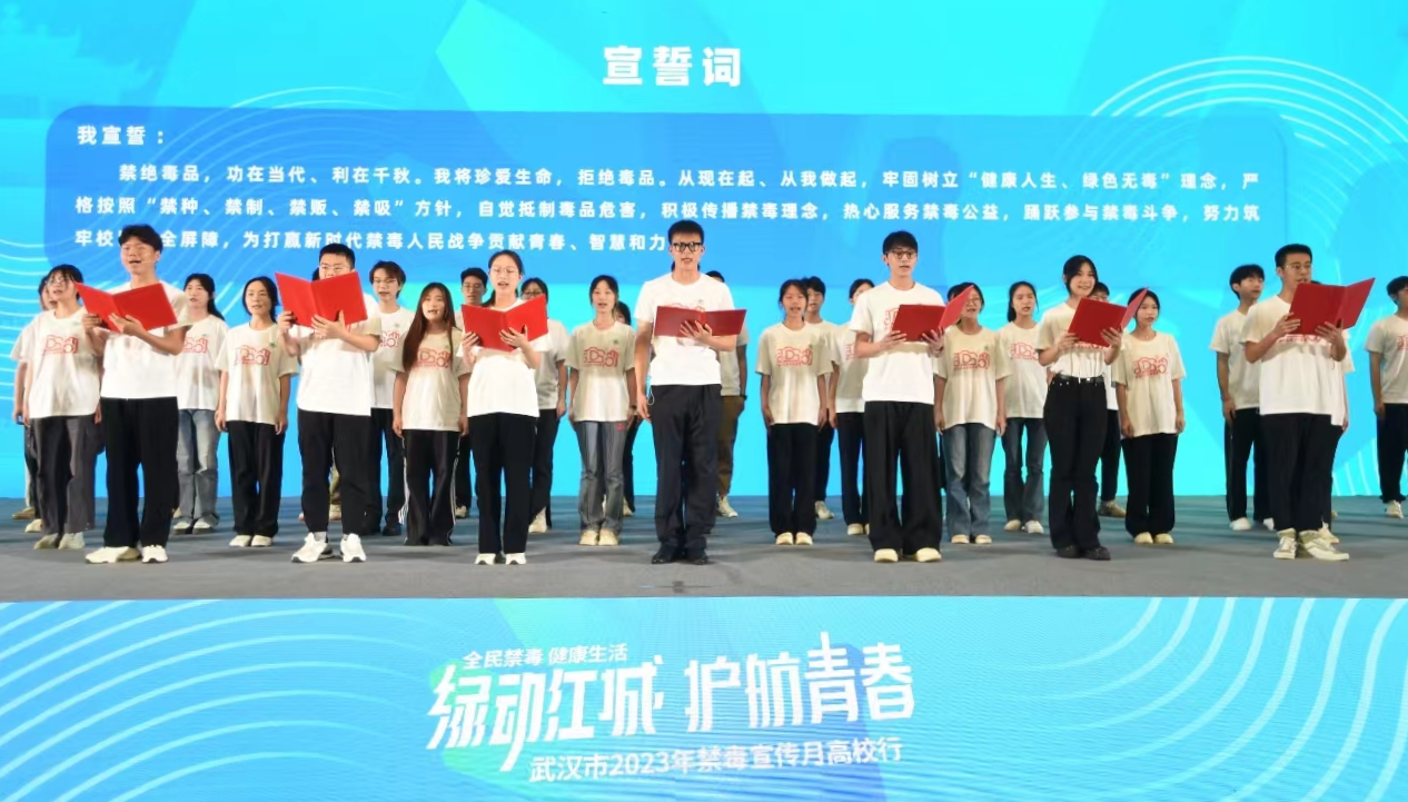 6月16日上午,在江汉大学体育场的“绿动江城 护航青春”高校行禁毒宣传活动现场,来自全市83所高校的近2000名师生代表共同发出青春誓言。这场由武汉市禁毒委联合江汉大学、长江日报报业集团等单位举办的活动,让武汉地区高校形成自觉抵制毒品的浓厚氛围。
