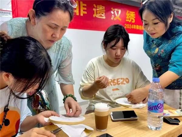 本次汉绣技艺培训班得到了附近青年朋友们的积极响应,全场座无虚席。黄龙山社区的党委书记邱颖更是邀请到了国家非物质文化遗产汉绣项目代表性传承人黄春萍老师担任本次培训的主讲人。黄春萍老师向在场汉绣学习者们详细介绍了汉绣的基本知识和针法技巧,并进行了一对一的耐心指导,黄老师指出:“刺绣是一个非常享受和创造美的过程,从颜色搭配到穿针引线再到细致绣制,每一步都需要大家投入极高的专注力和耐心。”邱颖书记也踊跃参与到本次活动中,与青年朋友们一起共同学习汉绣技法,体验汉绣之美。