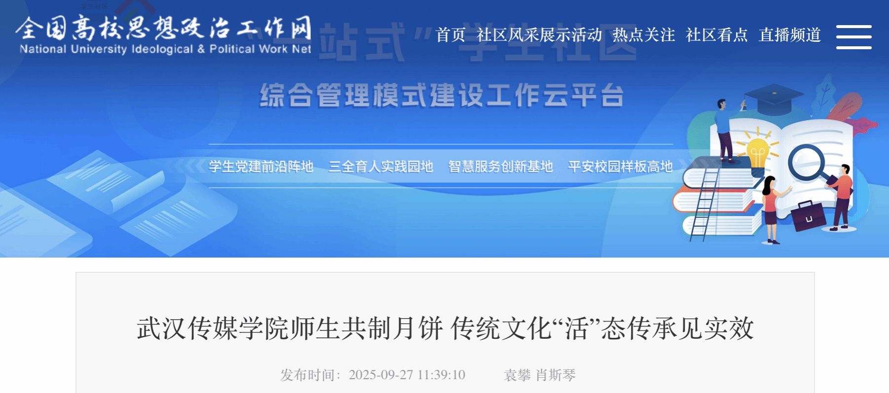 (通讯员袁攀 肖斯琴)中秋将至,为传承中华优秀传统文化、深化劳动教育实践,9月26日,校团委联合电影与电视学院、校烹饪社,在“一站式”学生社区开展“月映校园,饼承雅韵”冰皮月饼制作文化体验活动,校团委书记瞿宗巍、电影与电视学院党总支书记陈磊、辅导员老师及百余名学生共同参与,在手工实践中感受传统节日魅力。