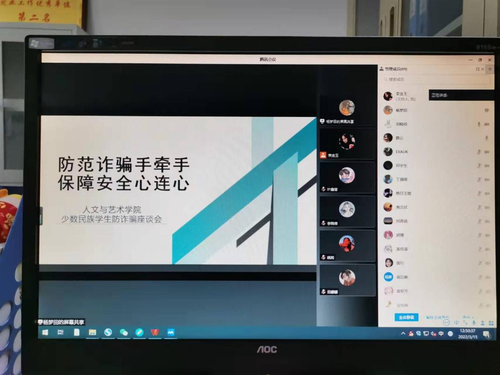 本次校园安全教育活动以一场生动有趣的《防范诈骗手牵手,保障安全心连心》主题座谈会拉开序幕。3月15日下午12点半,人文与艺术学院党总支部副书记吴斌、人文与艺术学院组织员荣金玉、人文与艺术学院学生第一支部书记刘晓萱、人文与艺术学院学生第二支部书记孟成龙、19级辅导员葛清源、21级辅导员杨梦田及人文与艺术学院少数民族学生代表共同采取“线上”的方式参与了此次活动。本次座谈会由人文与艺术学院党总支部组织员荣金玉主持。
