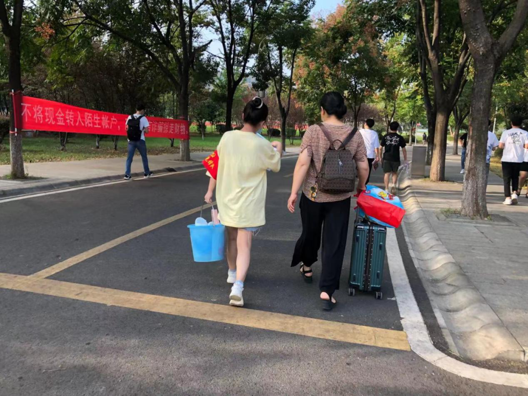 (少数民族学生党员徐佳琪同志帮助新生家长搬运行李)