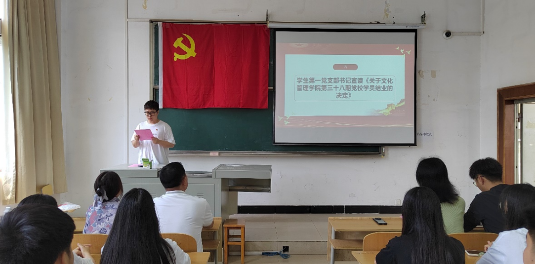 随着学习的结束,学生第一党支部书记王喆同志宣读《文化管理学院分党校关于第三十八期党校学员结业的决定》,经考核,共有20名入党积极分子,13名发展对象,5名预备党员顺利结业。学生第二党支部书记陈可冉同志宣读《文化管理学院分党校关于第三十八期党校学员评优的决定》,评选出优秀学员1名,优秀小组长3名,优秀学习小组2个,并给予表彰。