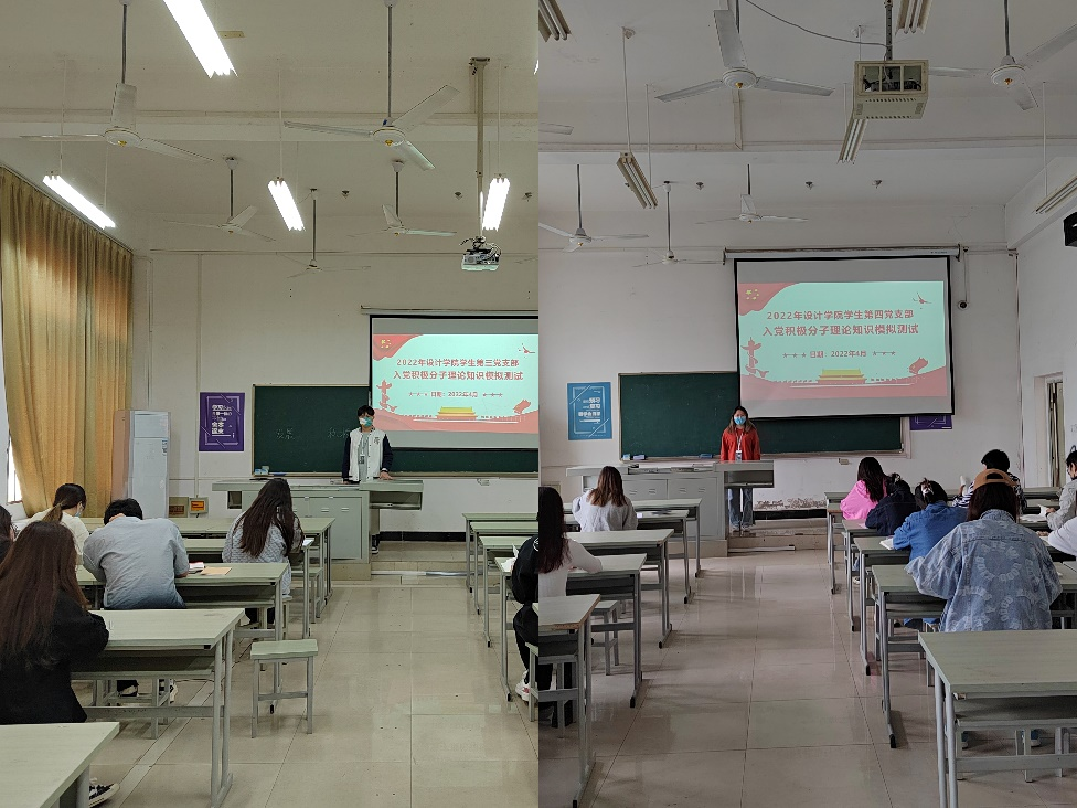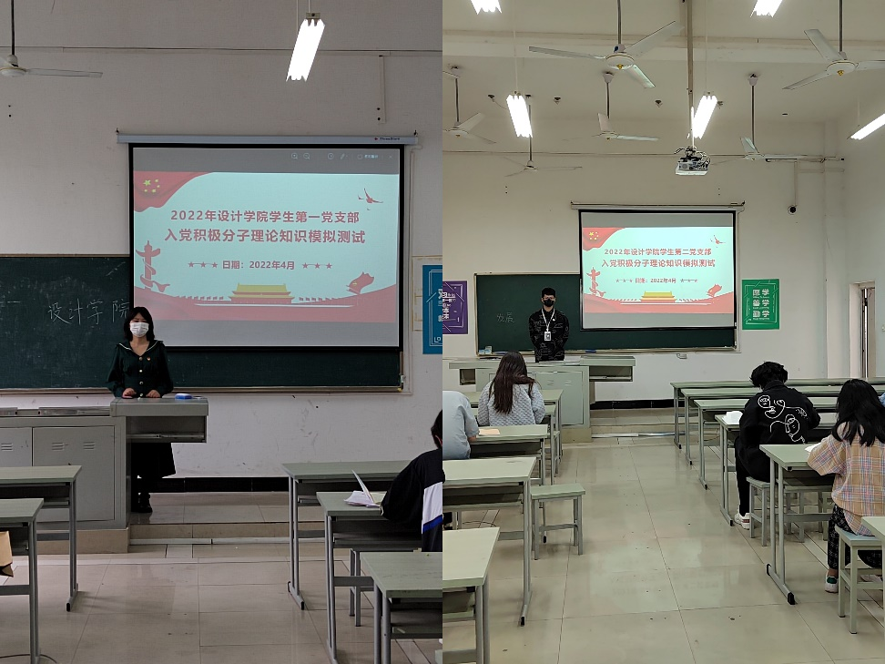 2022年4月29日,在设计学院党总支部的指导下,各学生支部统一组织,分别在4202、4203、4204、4205教室顺利举行党的基本理论知识模拟测试。学院党总支部组织员董玲东、学生第一支部书记黄好、学生第二支部书记冯雄杰、学生第三支部副书记孟帅航、学生第四支部书记刘念参加了此次模拟测试监考工作。