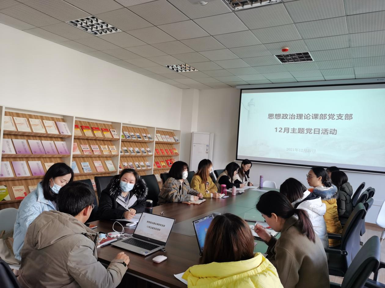 2021年12月22日,思想政治理论课部支部书记李玉林在8201会议室作“学习贯彻党的十九届六中全会精神”专题学习,思想政治理论课部全体教职工共同参加学习。