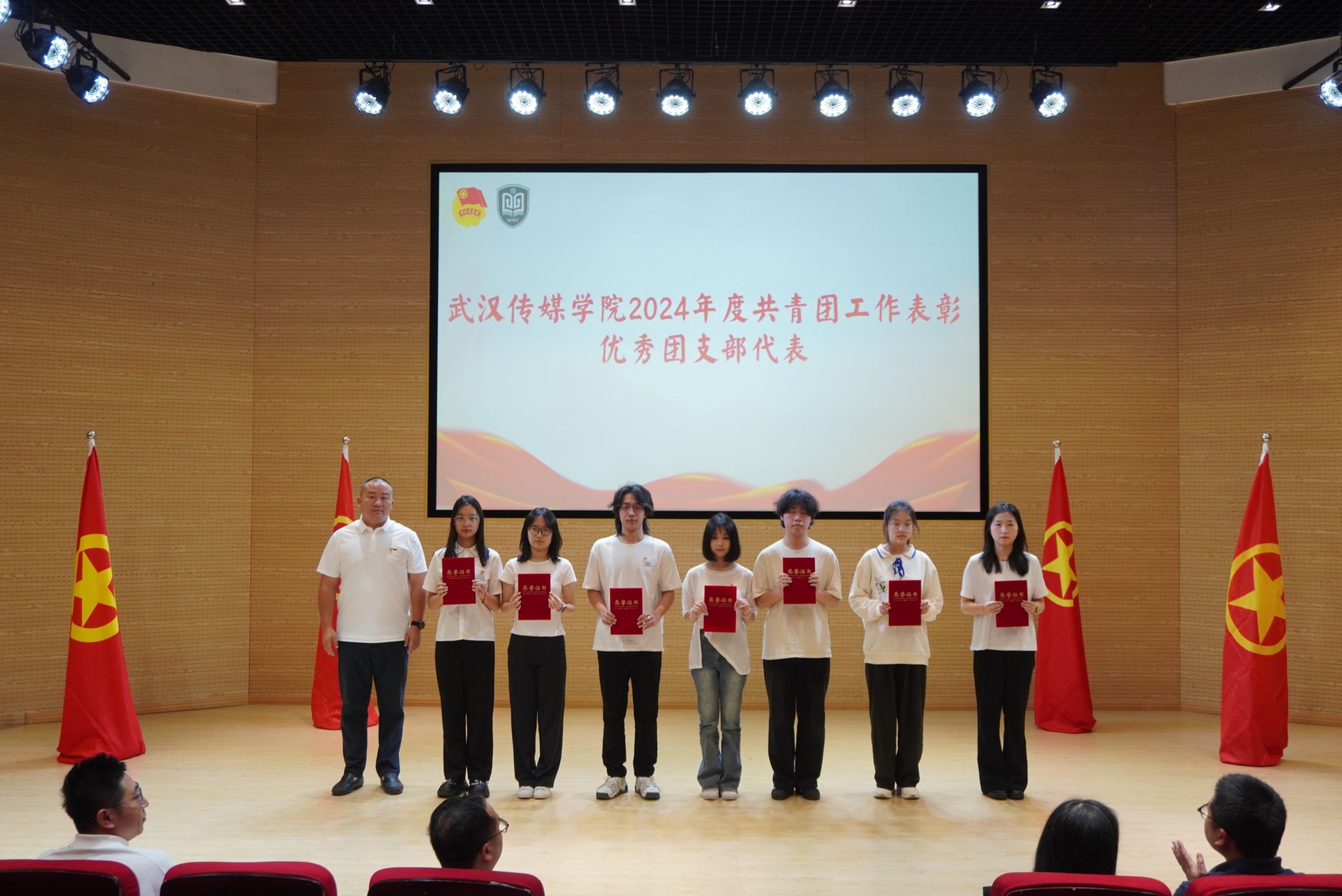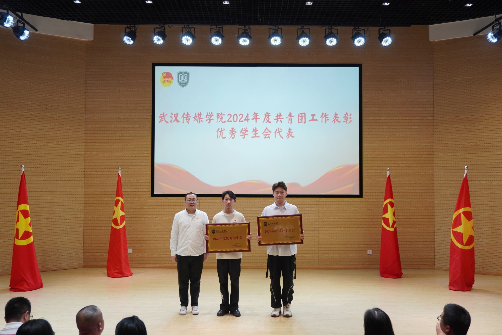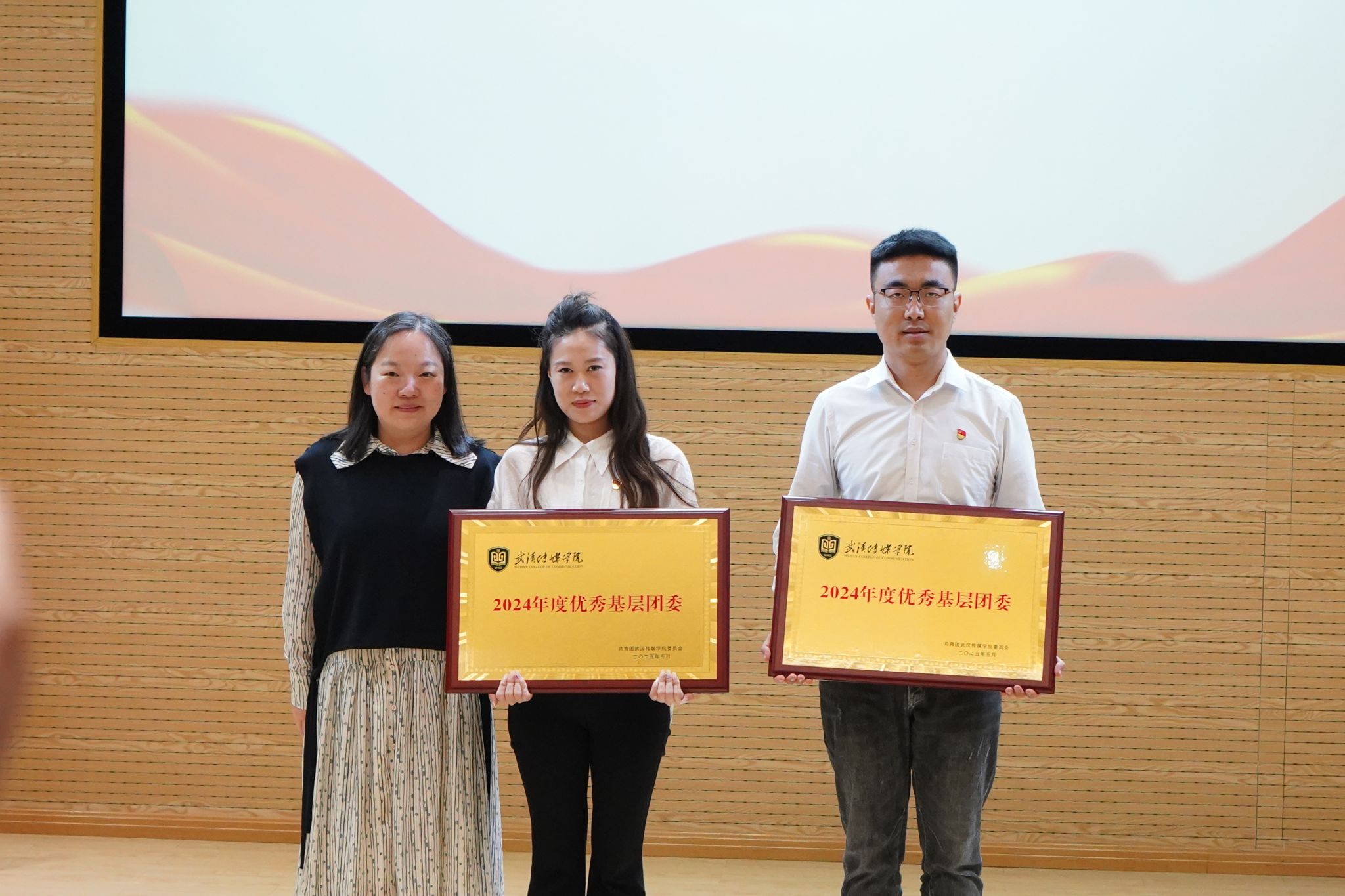 大会在庄严的国歌声中开幕。校团委书记瞿宗巍宣读了《关于表彰2024年度共青团工作先进集体和先进个人的决定》。广电B2302班团支部、播音B2301班团支部等9个团支部荣获“红旗团支部”称号;传播B2203班团支部等27个团支部获“优秀团支部”称号;杨黎冲等103名学生、李思思等9位老师获评“优秀共青团干部”;甘诗怡等289名同学获评“优秀共青团员”;张娟等78名同学获评“优秀学生干部”;熊恋令等113名同学因志愿服务表现突出获评“优秀志愿者”称号。播音主持艺术学院学生会、电影与电视学院学生会荣获“优秀学生会”称号,播音主持艺术学院团委、电影与电视学院团委荣获“优秀基层团委”称号。校领导为获奖代表颁奖,现场掌声热烈。