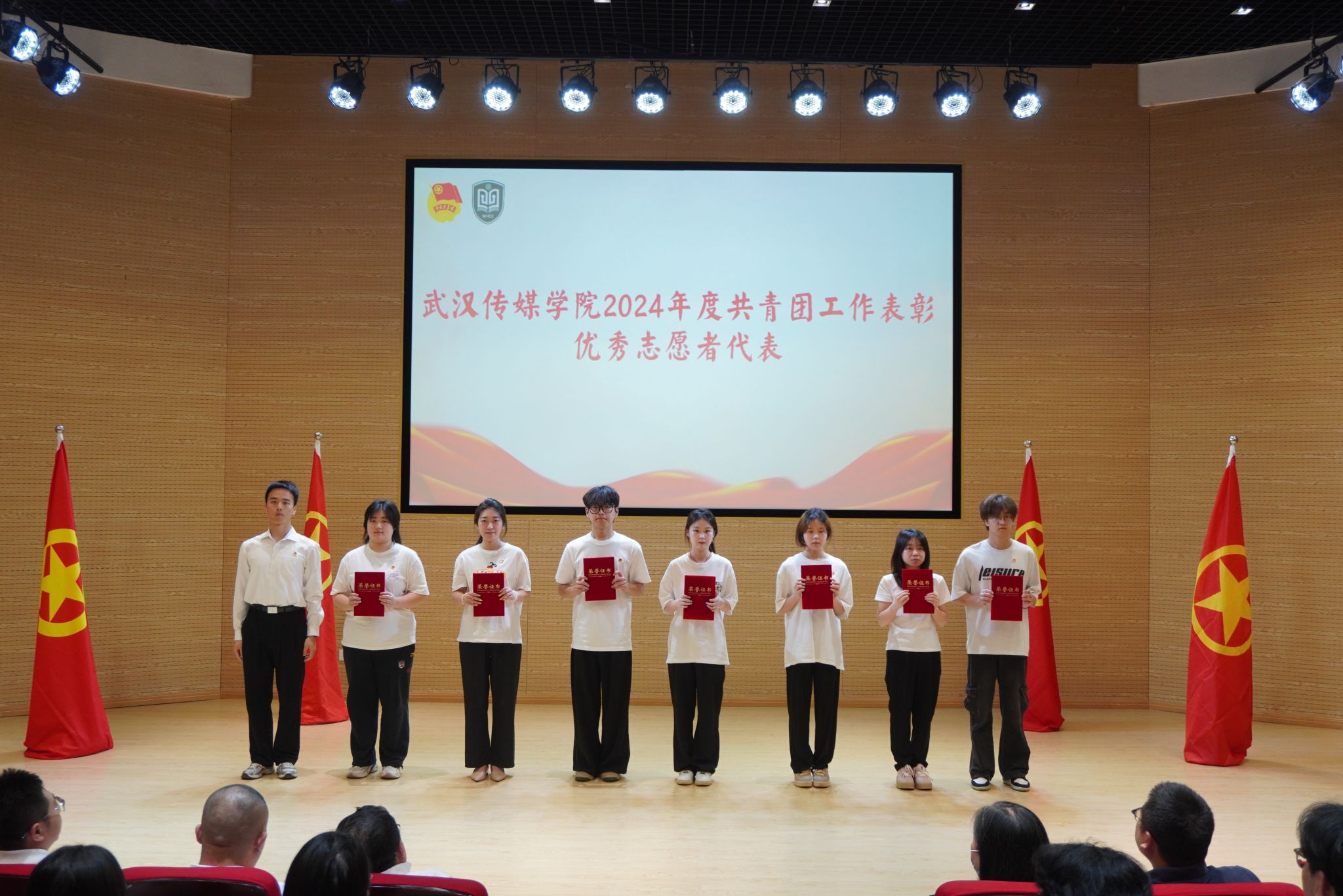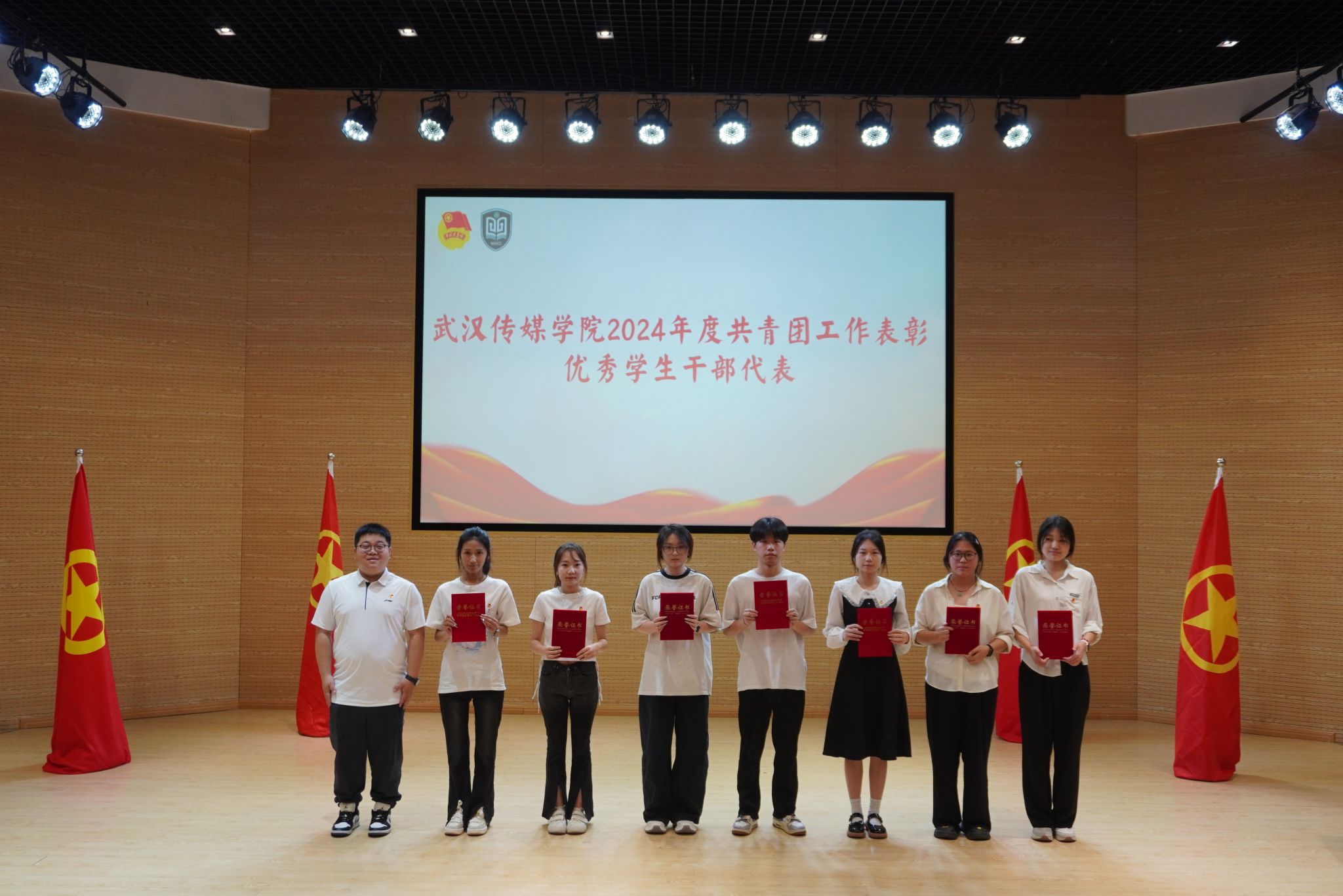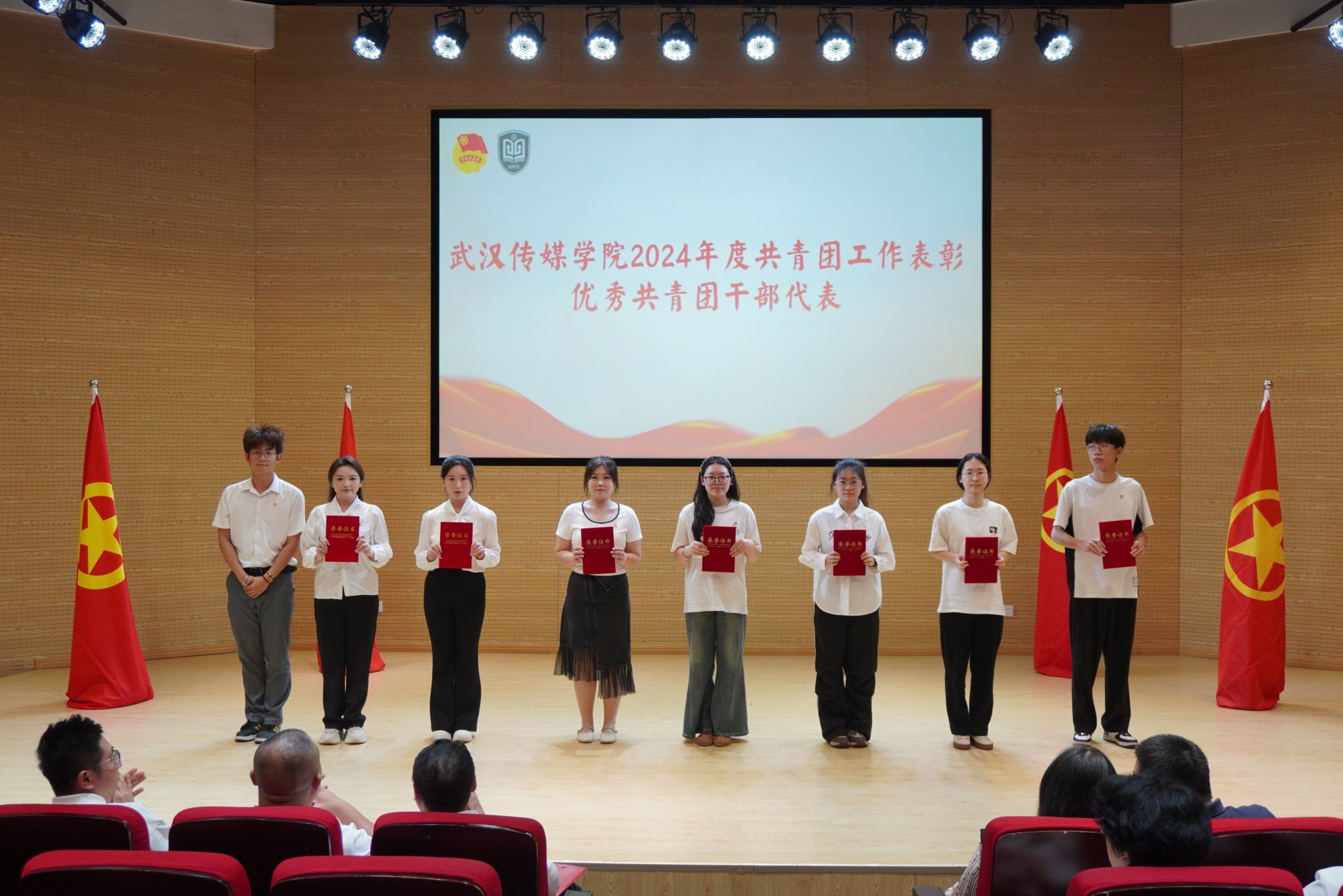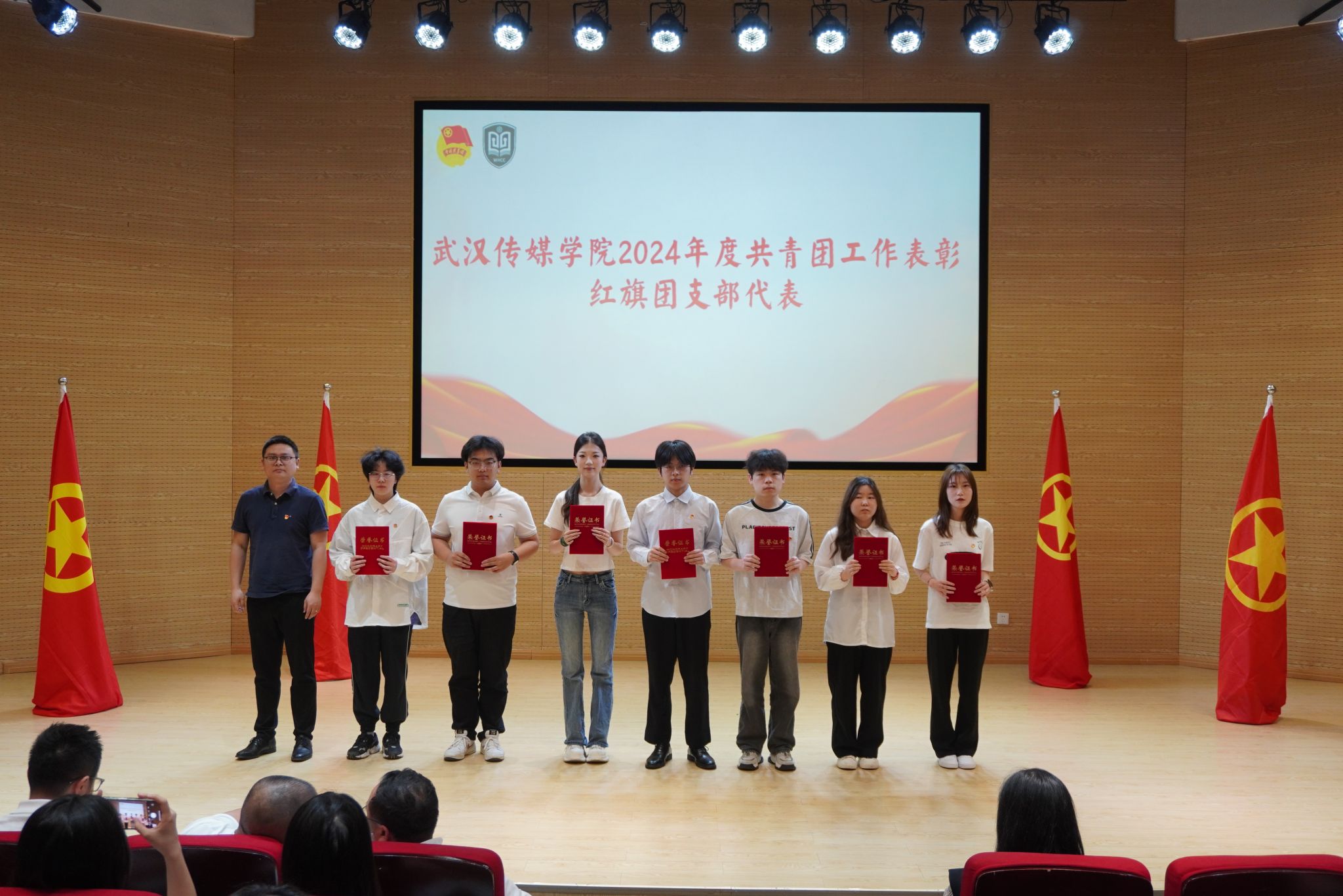 大会在庄严的国歌声中开幕。校团委书记瞿宗巍宣读了《关于表彰2024年度共青团工作先进集体和先进个人的决定》。广电B2302班团支部、播音B2301班团支部等9个团支部荣获“红旗团支部”称号;传播B2203班团支部等27个团支部获“优秀团支部”称号;杨黎冲等103名学生、李思思等9位老师获评“优秀共青团干部”;甘诗怡等289名同学获评“优秀共青团员”;张娟等78名同学获评“优秀学生干部”;熊恋令等113名同学因志愿服务表现突出获评“优秀志愿者”称号。播音主持艺术学院学生会、电影与电视学院学生会荣获“优秀学生会”称号,播音主持艺术学院团委、电影与电视学院团委荣获“优秀基层团委”称号。校领导为获奖代表颁奖,现场掌声热烈。