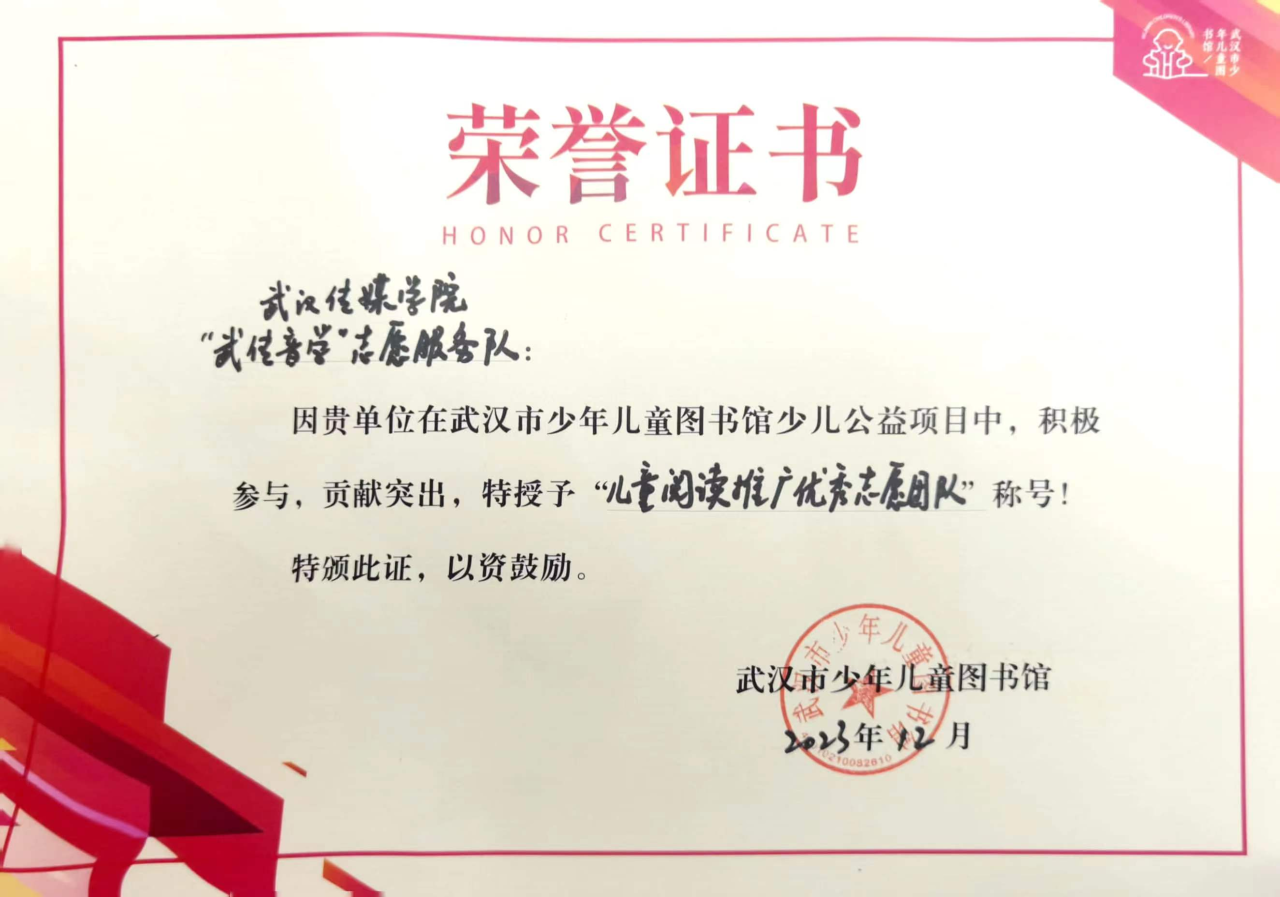 2023年12月17日上午,“亲子共读·陪伴是最美童年”活动年度展示暨武汉市少年儿童图书馆志愿者颁奖典礼活动在中南剧院举行,米兰体育网页版登录人文与艺术学院音乐学专业“武传音学”志愿服务队受邀参加,并喜获“2023年儿童阅读推广优秀志愿团队”称号。