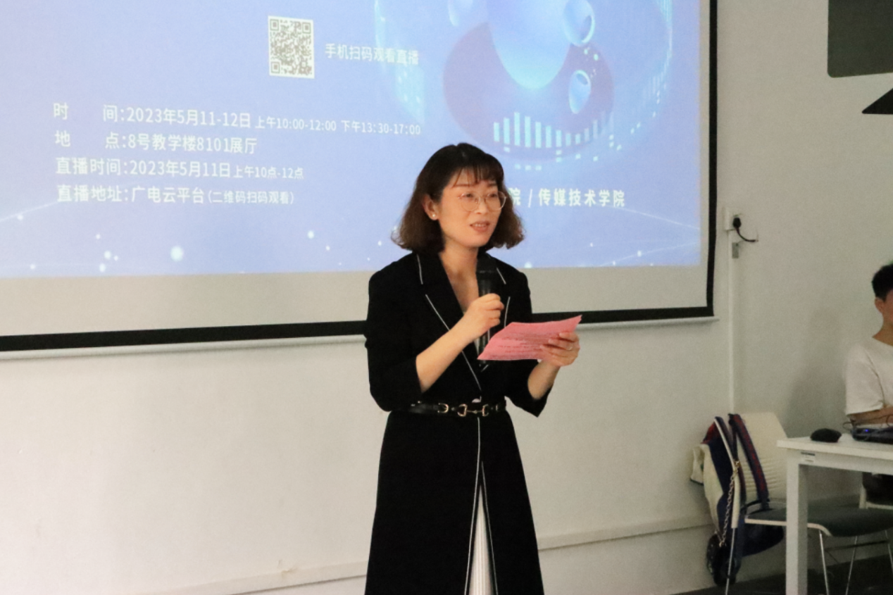 开幕式第一项,传媒技术学院林丽萍院长发言致辞。据林院长介绍,本次展览的22件优秀作品,涵盖视音频类的智能制造、数字文旅、数字校园、数字物流和新材料、数字灌溉、数字防灾、数字医疗、数字交通等9大类数字经济产业应用场景。林院长说:“本届展览强化创造性,并搭建‘学、用、展、评、转’综合平台,塑造文化育人、专业育人的新赛道。”