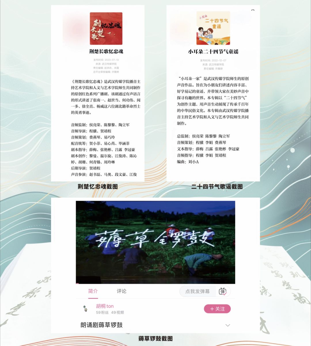 中文系指导老师白云玲称:“学生在展现‘楚韵’这一主题时,运用自己学到的中国文学和中国传统文化知识,深入挖掘地域文化,将古典文化与现代文化融合,再创新故事,以小见大,将荆楚大地上的题材放到社会上推广,宣传荆楚优秀文化。”