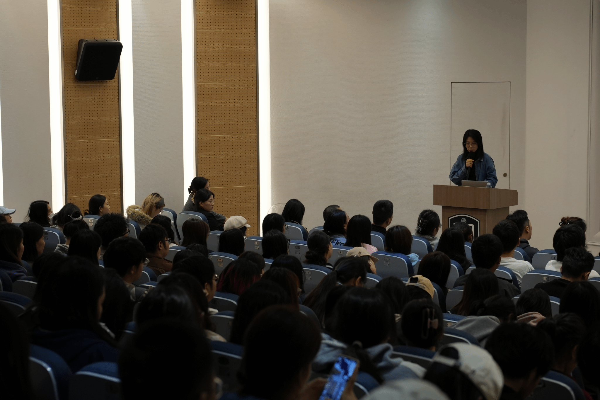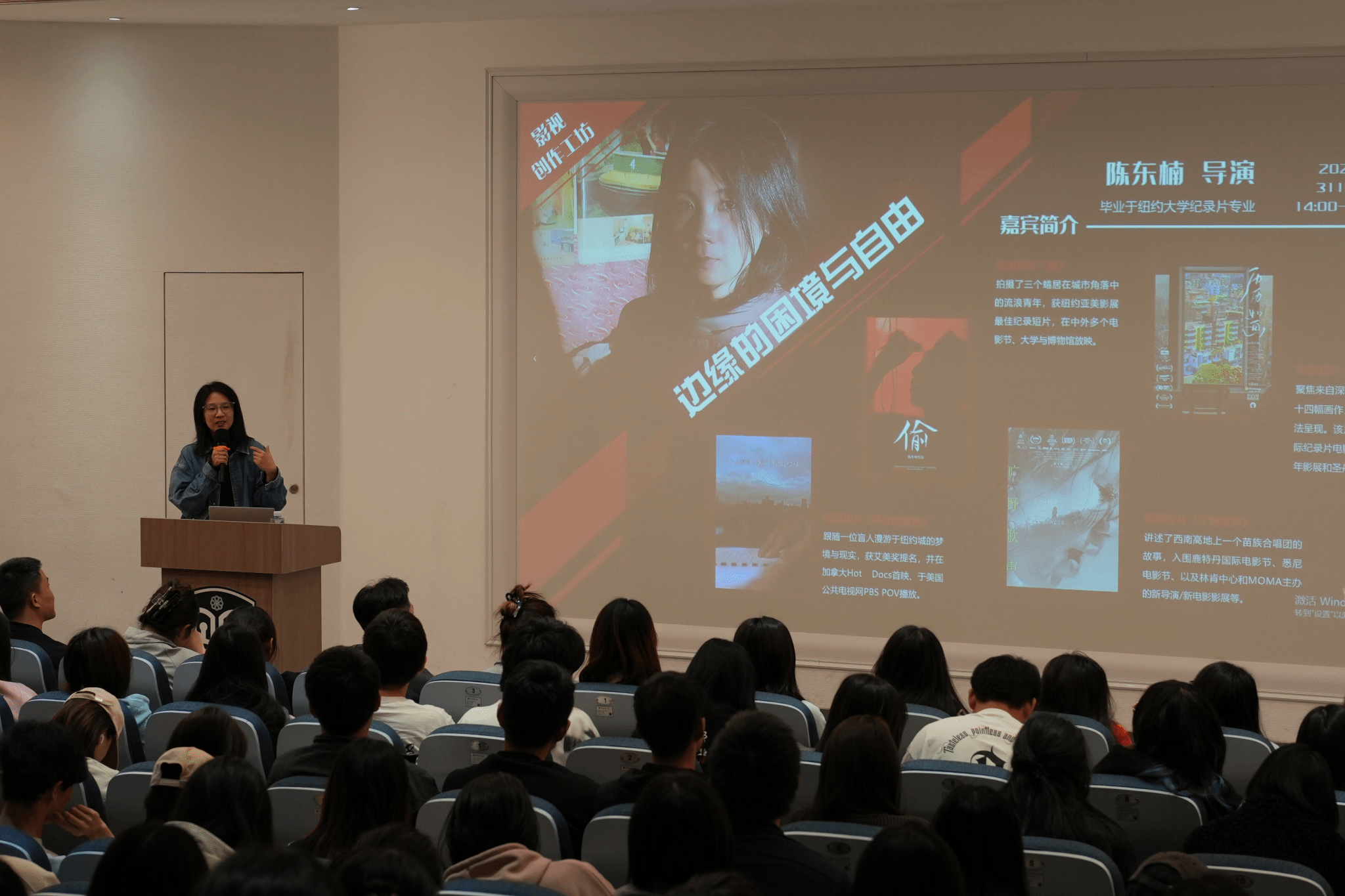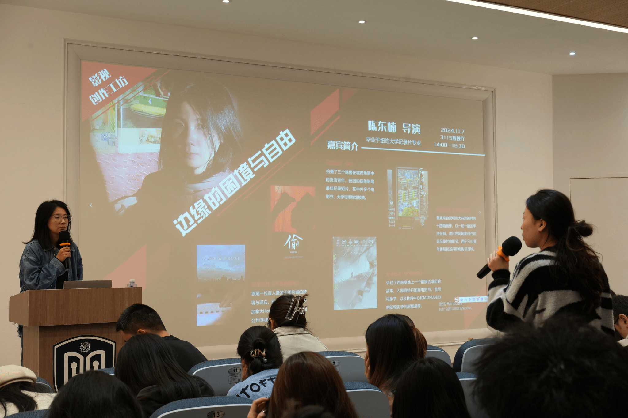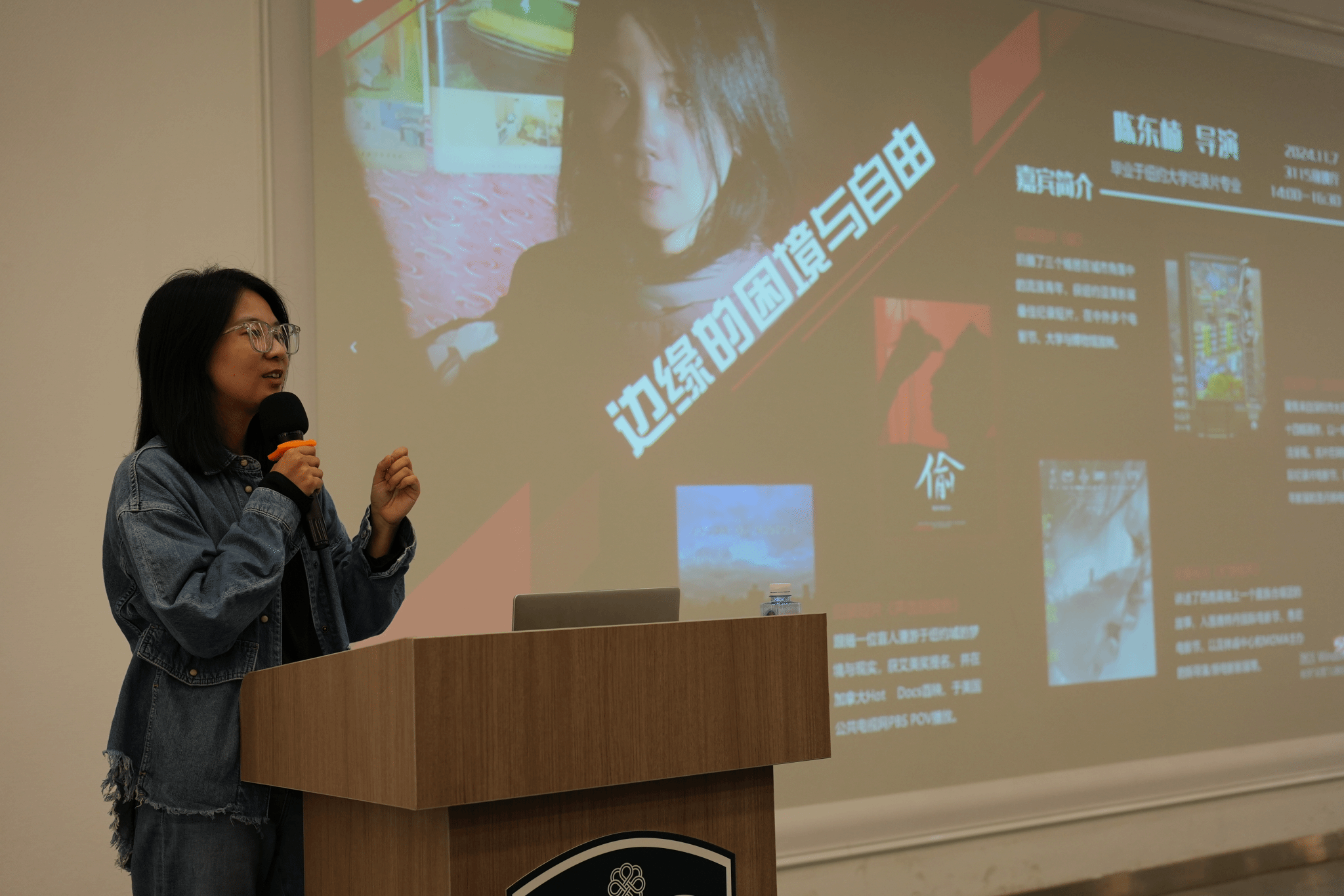 活动伊始,在场师生共同观看了纪录长片《旷野歌声》,该片描述了西南高地上一个苗族合唱团的故事。放映结束后,陈东楠导演与大家分享了她在研究生学习以及拍摄期间的所思所感,她讲述到:“我最开始在央视实习,在实习的办公室书架上有很多关于中国纪录片的书,记得最清楚的一个片子是讲中央美院的一个人体模特,他是一个很边缘的小人物,但是他又是一个很信仰自己职业的人,他觉得人体的美特别神圣,他会在大街上练习他的各种姿势。影片中的这些镜头,让我感受到了一种特别神圣的光辉,是我之前拍片子时没有感受到的,在看完这个片子后我就感兴趣了,于是我选择申请了纽约大学的纪录片专业。”
