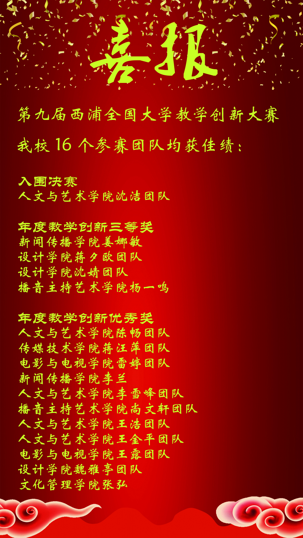 我校于去年11月选拔出17个团队或个人,经历仪态纠正、课程打磨、视频制作等环节。最终16个团队或个人报名参赛,1个进军决赛,4个荣获三等奖,11个荣获优胜奖。具体成绩如下。
