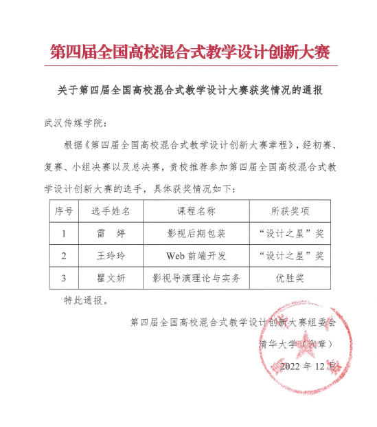 “第四届全国高校混合式教学设计创新大赛”结果于近日揭晓,我校新闻与传播学院副教授王玲玲和电影电视学院讲师雷婷获“设计之星”奖。