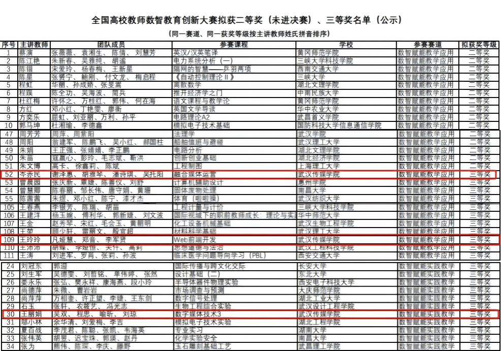 (通讯员 赵一楠)4月30日,由武汉大学举办的“全国高校教师数智教育创新大赛”圆满落幕。我校新闻传播学院王玲玲团队、岑赤民团队,设计学院王丽娟团队凭借极具创新性与实践性的教学成果脱颖而出,斩获国赛三等奖。